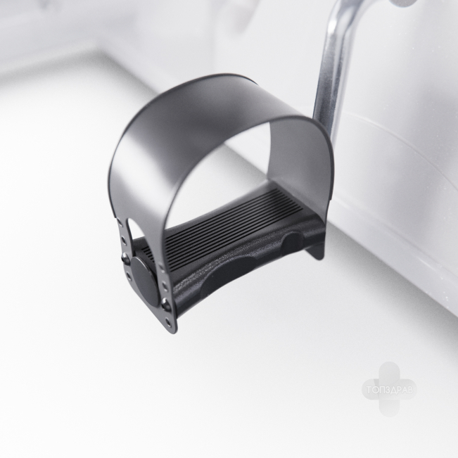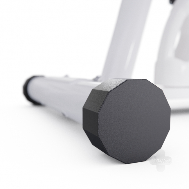 Педальный узел оснащен однокомпонентным шатуном, а система нагрузки - ременная. Вес маховика составляет 1 кг, инерционный вес - 2 кг. Велотренажер имеет бесступенчатую систему нагрузки, которую можно регулировать механически. Компенсаторы неровностей пола помогут установить тренажер на любую поверхность.